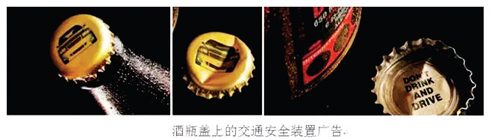 美國(guó)將警示語(yǔ)作為酒品包裝的強(qiáng)制性標(biāo)注內(nèi)容,要求飲料,酒的品牌標(biāo)簽、獨(dú)立的前標(biāo)簽或者背標(biāo)簽、側(cè)標(biāo)簽都應(yīng)獨(dú)立,并有別于標(biāo)簽中其他信息地標(biāo)示:“政府警示,根據(jù)普通外科醫(yī)生建議,孕婦不應(yīng)該飲酒,以防止新生兒缺陷,飲酒會(huì)減弱個(gè)人駕駛車(chē)或操控機(jī)械的能力并可能引發(fā)健康問(wèn)題。”此外,國(guó)外的產(chǎn)品包裝設(shè)計(jì)上也植入了公益理念。如上圖廣告可對(duì)飲酒人群針對(duì)性的進(jìn)行廣告宣傳,采用打開(kāi)酒瓶蓋必須以破壞“車(chē)輛”為代價(jià)的形式,傳達(dá)喝酒不能開(kāi)車(chē)的安全理念。