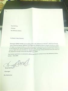 SkyBahamas航空公司給黃小姐開了一張情況說明,稱飛機確實早于18點45分起飛。