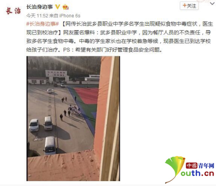 中國青年網記者就此事向武鄉(xiāng)縣職業(yè)中學進行求證,該校辦公室劉老師稱,目前有二十余位同學在縣人民醫(yī)院住院治療。事情發(fā)生后學校領導高度重視,縣領導和教育局領導也都前往醫(yī)院看望生病學生。