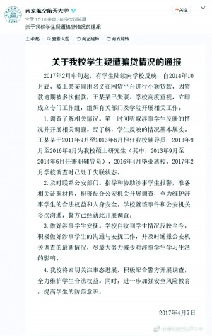 在4月7日下午,“@南京航空航天大學”官微發(fā)布了“關于我校學生疑遭騙貸情況的通報”,通報稱,從2017年2月中旬起,有學生陸續(xù)向?qū)W校反映,自2014年10月底,被王某冒用名義在網(wǎng)貸平臺進行小額貸款,因貸款逾期被多次催款,王某已失聯(lián)。學校高度重視,立即成立專門工作組,組織有關部門及學院開展相關工作。經(jīng)調(diào)查了解,學生反映的情況基本屬實。
