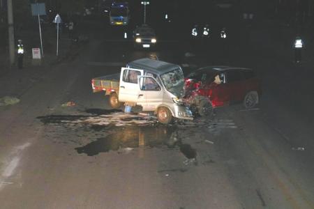 民警趕到現(xiàn)場發(fā)現(xiàn),一輛紅色小型普通客車與一輛銀色輕型普通貨車相撞,兩車受損嚴(yán)重。紅色小型普通客車旁還躺著一名年輕男性胡某某(已確認(rèn)死亡)。