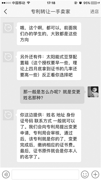 在一家機(jī)構(gòu)網(wǎng)店上,北青報(bào)記者看到,曾經(jīng)購買過“實(shí)用新型專利申請或轉(zhuǎn)讓”的賣家評價(jià)稱,“感覺很方便,不用自己一個(gè)人絞盡腦汁熬夜了,服務(wù)為自己省了很多力,果然人多力量大,相信最后能拿到證書。”