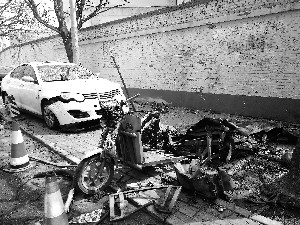 昨日,北京晨報記者來到酒仙橋二街坊附近,在1號樓樓下聚著一群人,正在討論凌晨爆炸的事情,“簡直就是個移動隱患”,“還好不是白天,不然肯定有人受傷”。記者看到,一輛綠色三輪車嚴重損毀,車輪扭曲倒在地上,車身部分被炸成了一張橫鋪著的大鐵皮,經(jīng)過灼燒后變得焦黑。三輪車的部分零件丟失,旁邊的樹上掛著鐵條,十幾米外的墻邊散落著三輪車的架子,而車輛原本放置電瓶的地方空無一物。在三輪車旁,一個大煤氣罐被炸成三部分,中間圓筒狀變成一塊鋪展后約1平方米的厚鐵皮,上下兩端則變成兩個圓形的蓋子(如圖)。