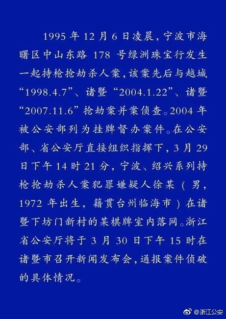 最新消息:浙江省公安廳將于3月30日下午15時(shí)在諸暨市召開(kāi)新聞發(fā)布會(huì),通報(bào)案件偵破的具體情況。