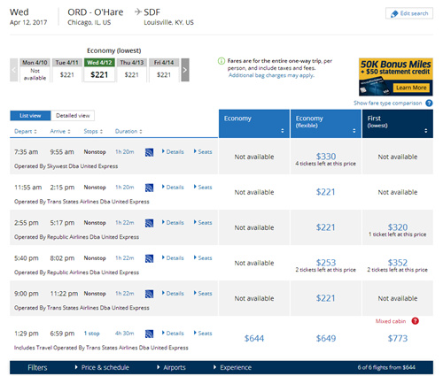 圖說:記者在美聯(lián)航官網(wǎng)搜索奧黑爾國際機場飛往肯塔基州路易斯維爾的航班。