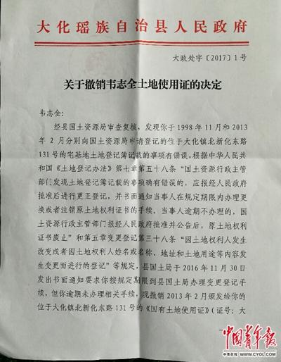 2月9日,大化縣人民政府下發(fā)大政處字〔2017〕1號文《關(guān)于撤銷韋志全土地使用證的決定》。 中國青年報·中青在線記者 謝洋/攝