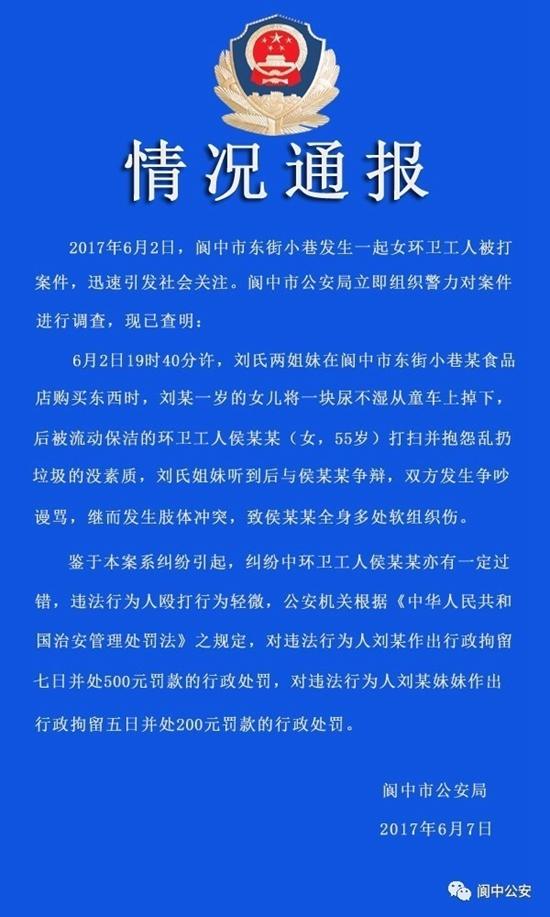 6月2日,閬中市東街小巷發(fā)生一起女環(huán)衛(wèi)工人被打案件,迅速引發(fā)社會關(guān)注。閬中市公安局立即組織警力對案件進(jìn)行調(diào)查,現(xiàn)已查明: