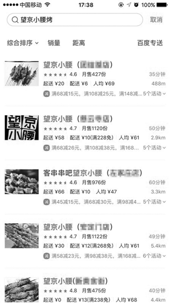 外賣平臺(tái)上有15家店自稱“望京小腰”