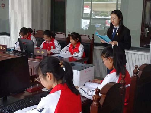 隨后,學(xué)生們?cè)趯徟蟹ㄍヅe行了模擬法庭活動(dòng),他們分別擔(dān)任審判長、審判員、書記員、代理人、原被告等不同的法庭角色,法院干警還向大家分發(fā)了《山西法院保護(hù)未成年人十大典型案例》,并進(jìn)行模擬講解。