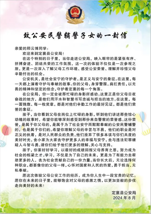 為進(jìn)一步增強(qiáng)中小學(xué)生反詐、禁毒、交通安全意識(shí),通過(guò)小手拉大手等形式,大力學(xué)習(xí)、宣傳、弘揚(yáng)武霖同志英勇無(wú)畏、忠誠(chéng)為民的高尚品質(zhì)。8月20日上午,定襄縣公安局精心策劃,組織開展了“警娃探警營(yíng)”主題警營(yíng)體驗(yàn)日活動(dòng),50余名民輔警子女和警爸警媽共同走進(jìn)警營(yíng),體驗(yàn)警察生活、感受警營(yíng)文化。