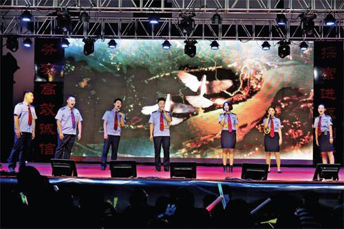 這場以“頌歌獻(xiàn)給黨,共圓中國夢”為主題的文藝晚會,是保安押運(yùn)人精心組織,自編、自導(dǎo)、自演的一臺節(jié)目,就像該公司黨委書記陳志平所說:“這場文藝晚會是我們保安押運(yùn)人向黨95歲華誕獻(xiàn)上的頌歌?!?月29日第一場晚會于晚8時正式上演,晚上7時便有觀眾陸續(xù)來到演出現(xiàn)場。第一場晚會就讓觀眾大呼過癮,節(jié)目形式多樣,有小合唱、獨(dú)唱、配樂詩朗誦、舞蹈、雙簧、小品、服裝秀等。其中舞蹈《映山紅》、男生獨(dú)唱《紅旗飄飄》、電聲樂隊(duì)《閃閃的紅星》歌曲串燒等用不同的藝術(shù)形式表現(xiàn)了保安押運(yùn)人對黨和祖國的熱愛之情,感染了現(xiàn)場的觀眾;而雙簧表演《文武雙全》將晚會現(xiàn)場氣氛推向高潮,兩位表演者夸張的表情、搞笑的扮相引得觀眾連連叫好。