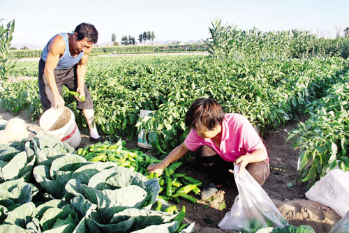 7月13日,原平市新原鄉(xiāng)解放街村農(nóng)民將收獲的青椒銷往市場(chǎng)。該市積極引導(dǎo)城郊農(nóng)民利用地理優(yōu)勢(shì),大力調(diào)整種植結(jié)構(gòu),加大特色農(nóng)業(yè)開發(fā)力度,因地制宜種植紫甘藍(lán)、青椒等新鮮無公害蔬菜,不僅豐富了市民的菜籃子,而且鼓起了菜農(nóng)的錢袋子。(褚震 攝)