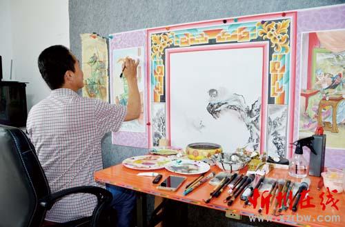 沒有了炕,沒有了施展畫藝的炕圍,王利廷就買了畫布,掛在墻上畫假炕圍。依然是卷書、夔龍、九針、萬不斷,依然是出水的芙蓉、怒放的牡丹、溫婉的仕女。點點色彩,點點心血。