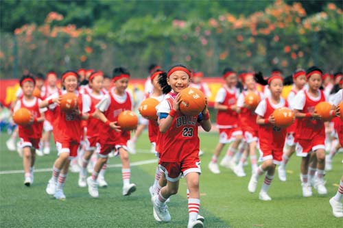 學(xué)生在運(yùn)動會上展示集體籃球操