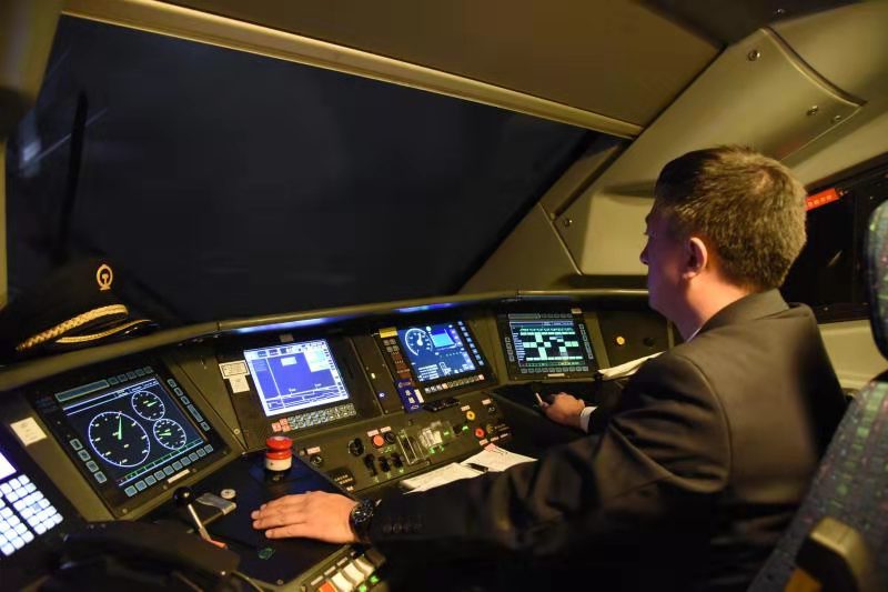 當(dāng)D6770次列車到達(dá)呼和浩特東站,弓國慶登上機(jī)車,與換班司機(jī)交接完畢后,插入IC卡,認(rèn)真核對行車數(shù)據(jù)、確認(rèn)操縱臺各儀表……各項安全準(zhǔn)備工作無誤后,隨著機(jī)車前方發(fā)車信號變?yōu)榫G燈,與車站進(jìn)行車機(jī)聯(lián)控確認(rèn),隨著一聲汽笛長鳴,動車組緩緩駛出呼和浩特東站?!皬氐撞t望,確認(rèn)信號,高聲呼喚,手比眼看”的標(biāo)準(zhǔn)化作業(yè)與每三十秒腳踩提醒踏板的一系列操作流暢默契……盡管這種周而復(fù)始的工作他已重復(fù)了成千上萬遍,但從不敢松懈。