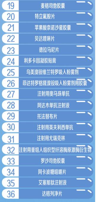 國家醫(yī)保局醫(yī)藥服務(wù)管理司司長熊先軍介紹,此次談判成功的藥品多為近年來新上市且具有較高臨床價(jià)值的藥品,涉及癌癥、罕見病、風(fēng)濕免疫、心腦血管、消化等10余個(gè)臨床治療領(lǐng)域。重點(diǎn)領(lǐng)域的5個(gè)基本藥物全部談判成功,22個(gè)抗癌藥、7個(gè)罕見病用藥、14個(gè)慢性病(含糖尿病、乙肝、風(fēng)濕性關(guān)節(jié)炎等)用藥、4個(gè)兒童用藥談判成功,進(jìn)一步優(yōu)化了目錄結(jié)構(gòu)。