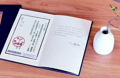 在溫州大學(xué)本科招生錄取現(xiàn)場,一本本藍(lán)色燙金的錄取通知書正整整齊齊地擺放在會議桌上,整裝待發(fā)。通知書整體采用中國傳統(tǒng)文書褶子樣式,封面是燙金的“錄取通知書”和學(xué)校?;眨獾资峭趺深}詞的校訓(xùn)“求學(xué)問是,敢為人先”。展開五折折頁,正面分別是瑞安市東源村木活字傳承人親手印刷的錄取證書頁、校長寄語、校歌,背面則是以溫州地理標(biāo)志大羅山為底、溫大建筑為前景的山水畫卷。