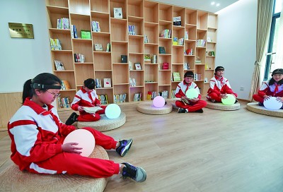 在浙江省嘉興市兒童青少年心理健康服務(wù)總站,學(xué)生們在體驗(yàn)“腦波球”。新華社發(fā)