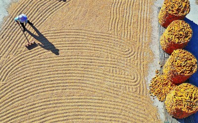 山東省臨沂市郯城縣郯城街道的農(nóng)民在晾曬玉米。新華社發(fā)