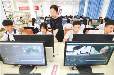 河北省邯鄲市涉縣職業(yè)教育中心數(shù)字媒體專業(yè)學(xué)生在老師指導(dǎo)下學(xué)習(xí)影視后期剪輯。郝群英攝(新華社發(fā))