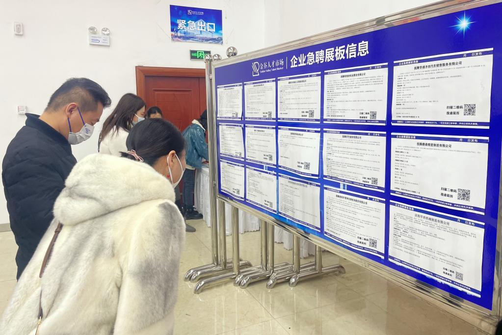 招聘會(huì)上,求職者在企業(yè)急聘展板前尋找崗位信息。(新華社記者武江民 攝)