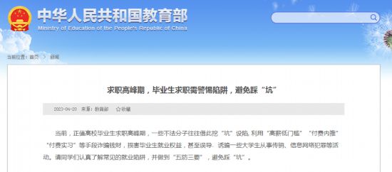 當(dāng)前,正值高校畢業(yè)生求職高峰期。教育部4月20日發(fā)布信息,提醒同學(xué)們認(rèn)真了解常見的就業(yè)陷阱,并做到“五防三要”,避免踩“坑”。
