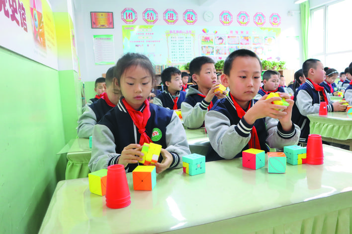 冬日暖陽(yáng)下,忻州市實(shí)驗(yàn)小學(xué)校園里一派生機(jī)勃勃的景象。武術(shù)訓(xùn)練場(chǎng)上,孩子們正在認(rèn)真扎馬步、練拳術(shù),一招一式打得虎虎生威,眼睛里閃爍著堅(jiān)毅和自信的光芒。百人腰鼓隊(duì)排著整齊的隊(duì)伍,伴著音樂(lè)的節(jié)奏不停變換著步伐,鼓槌上的紅綢子上下舞動(dòng),看得人眼花繚亂?;ㄊ交@球挑戰(zhàn)籃球極限,展示籃球技術(shù)和表演的完美結(jié)合?;犹K中,孩子們?cè)诃h(huán)擺的繩索中做著各種跳躍動(dòng)作……操場(chǎng)上,熱火朝天,教學(xué)樓里,每一間教室里都散發(fā)著濃濃的趣味性。“一撇一捺,書寫堂堂正正中國(guó)字”“編程要注意邏輯關(guān)系”“三原色是哪些顏色呢?”……這是市實(shí)驗(yàn)小學(xué)每周三開(kāi)展的第二課堂綜合實(shí)踐活動(dòng),也是孩子們最興奮最高興的校園時(shí)光。