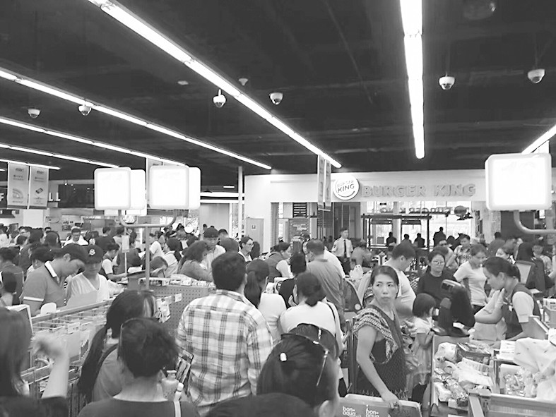 圖片說(shuō)明: 烏蘭巴托8月初開業(yè)的一家韓國(guó)商場(chǎng)收銀臺(tái)前人滿為患,絲毫沒(méi)有危機(jī)氛圍。楊濤攝