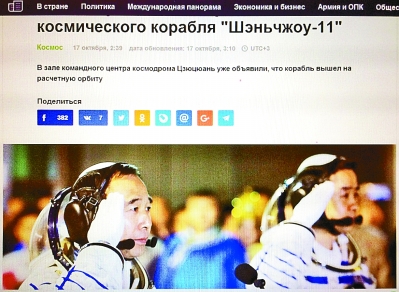 十月十七日,俄羅斯塔斯社網(wǎng)站第一時間發(fā)布的題為《中國成功發(fā)射神舟十一號載人飛船》的報(bào)道。本報(bào)駐莫斯科記者 汪嘉波攝/光明圖片