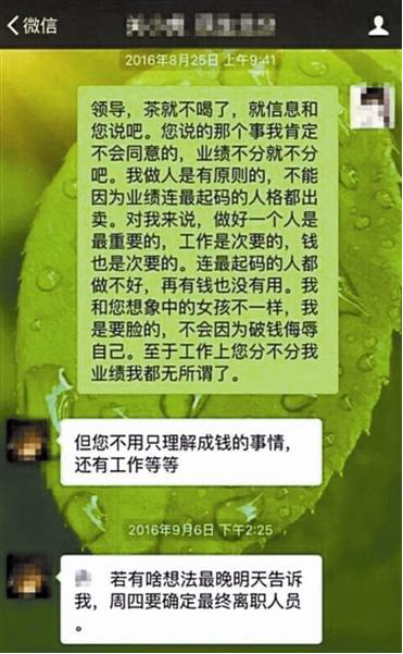 微信中還顯示,關(guān)某某在微信中多次以談“業(yè)績”為由,約女員工“出來見面聊聊”。對于如此扭曲的上下級關(guān)系,有評論稱,本是靠能力吃飯的行當(dāng),最后將“業(yè)績籌碼”演繹成“陪睡游戲”。除了反胃和憤怒,更多的是對這個時代的拷問。