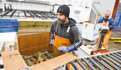 在美國緬因州波特蘭附近的海岸龍蝦公司,兩名工人正在把龍蝦裝箱。新華社發(fā)