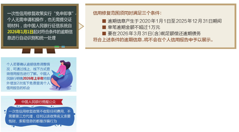 在進(jìn)行必要的技術(shù)準(zhǔn)備后,中國人民銀行于22日明確發(fā)布一次性信用修復(fù)政策有關(guān)安排。自2026年1月1日起征信中心將根據(jù)不同還款情形完成自動調(diào)整,相關(guān)逾期記錄不再在個人信用報告中展示。