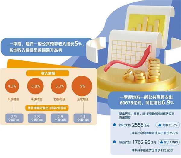 一季度,地方一般公共預(yù)算支出60675億元,同比增長6.9%。各地普遍在基本民生、教育、科技等重點領(lǐng)域保持較高支出強(qiáng)度。比如,湖北一季度地方一般公共預(yù)算支出2555億元,增長15.2%,其中社會保障和就業(yè)支出增長25.7%。陜西一季度一般公共預(yù)算支出1762.95億元,增長7.89%,其中科學(xué)技術(shù)支出增長125.63%?!案鞯刎斦С隼^續(xù)保持較快增長,衛(wèi)生、社保、科技和農(nóng)林水支出增速加快,財政公共服務(wù)和保障能力不斷增強(qiáng)?!奔质∝斦茖W(xué)研究所所長張依群表示。