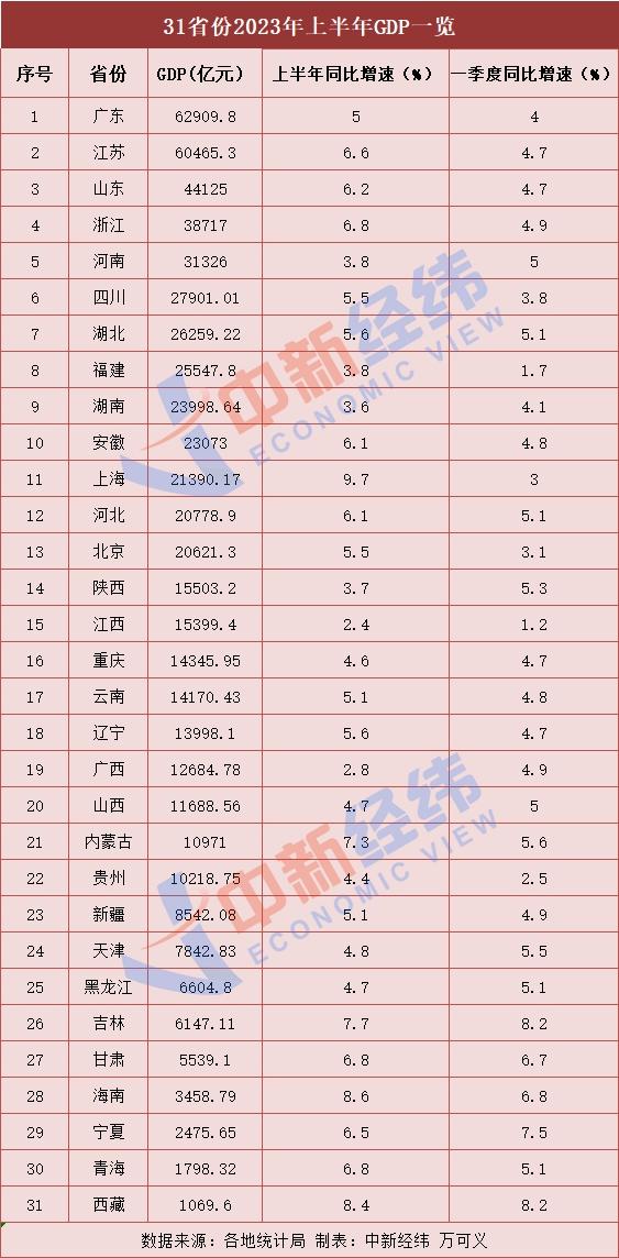 中新經(jīng)緯7月31日電 (萬可義)截至7月30日,31省份2023年上半年GDP數(shù)據(jù)已全部出爐。總量方面,粵蘇魯穩(wěn)居前三;增速方面,15省份高于“全國(guó)線”,上海勢(shì)頭最猛,增速達(dá)到9.7%。