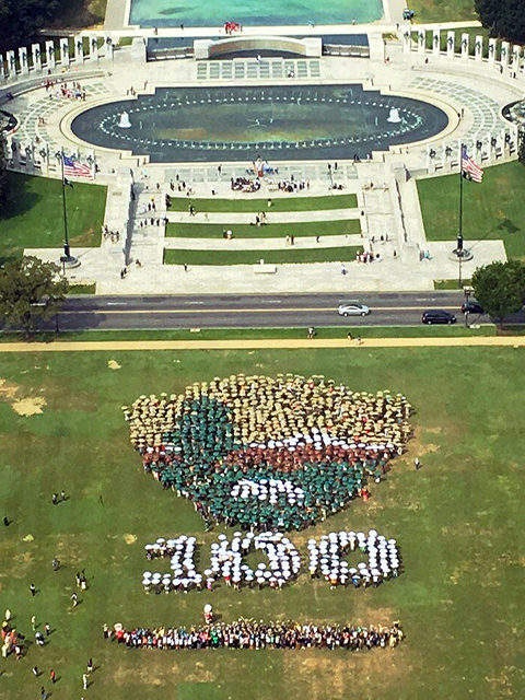 資料圖:8月25日,約千名民眾聚集在華盛頓紀念碑前的草地上,手舉各色雨傘,組成美國國家公園管理局的徽章圖案,慶祝美國國家公園管理局成立一百周年。新華社發(fā)