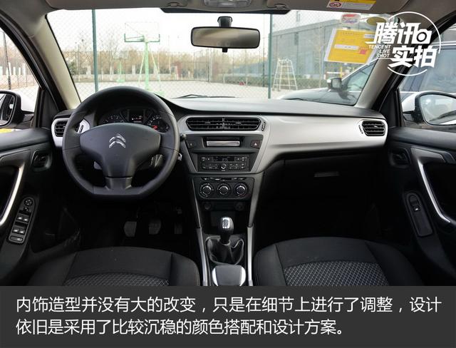 內(nèi)飾造型并沒有大的改變,只是在細(xì)節(jié)上進(jìn)行了調(diào)整,設(shè)計(jì)依舊是采用了比較沉穩(wěn)的顏色搭配和設(shè)計(jì)方案。中控臺(tái)的材質(zhì)還是硬塑料,做工和顏色搭配還算不錯(cuò),畢竟它是一臺(tái)雪鐵龍的入門級(jí)車型。三幅平底方向盤造型看著令人很有好感,而且手感也不錯(cuò),支持上下兩向調(diào)節(jié),并不能前后拉伸。指針式儀表盤黑底白字清晰易讀,表盤上新增了雪鐵龍法文LOGO和三叉星式圖案,上方顯示屏的顏色也從紅色變?yōu)榱税咨?。多媒體系統(tǒng)功能比較單一,可以提供收音機(jī)和通過底部USB接駁外部音源。
