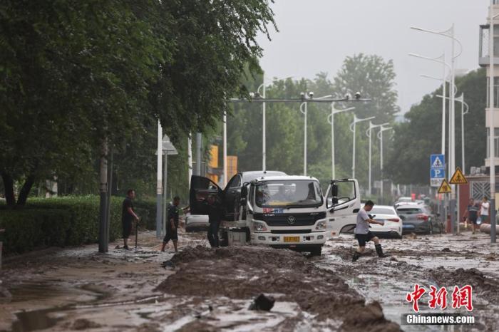 8月1日,北京市門(mén)頭溝區(qū)橋東街,救援車(chē)輛拉走受損汽車(chē)。中新社記者 盛佳鵬 攝