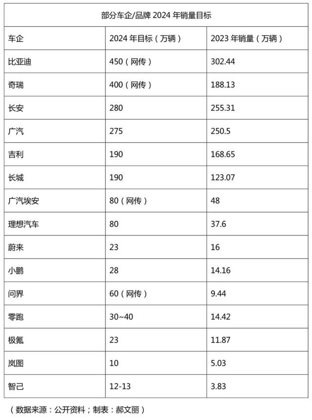有的車企理性十足,將2024年目標定在比2023年銷量略高;有的車企則相當狂熱,目標翻倍甚至翻幾倍!車企們2024年的目標能實現(xiàn)嗎?超高目標的車企哪來的自信?我們從中挑選了部分車企,對其公布的銷量目標進行盤點及分析,一探究竟。