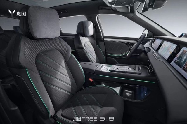 嵐圖FREE 318的內(nèi)飾主要采用了全新的黑+綠配色,大量觸感出色的軟性材質,滿足視覺和觸覺雙重質感,新車不僅搭載了能夠滿足當下的智能化體驗,像前排座椅頭枕等也進一步提升了視覺體驗。