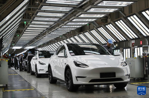 2023年12月22日,在特斯拉上海超級工廠內(nèi),工人在對出廠前的車輛進行漆面及門窗檢測。新華社記者方喆攝