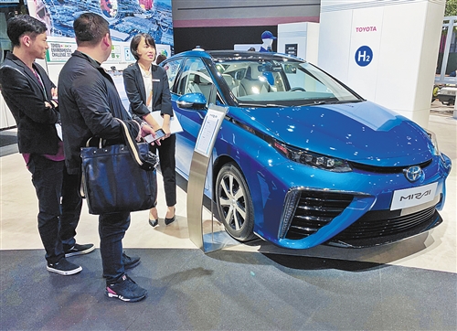 圖為在車展上拍攝的豐田Mirai氫燃料電池車。