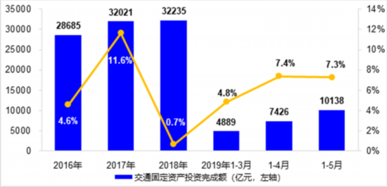 1-5月,交通固定資產(chǎn)投資完成10138億元,同比增長7.3%,較去年全年加快6.6個(gè)百分點(diǎn)。公路水路完成投資7537億元,同比增長4.8%,其中公路、內(nèi)河、沿海分別完成投資7115億元、215億元和196億元,同比分別增長4.5%、14.7%和8.1%。