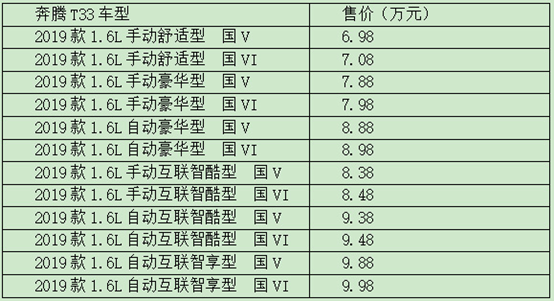 8月3日,一汽奔騰全新物聯(lián)網(wǎng)汽車(chē)T33正式上市。一汽轎車(chē)股份有限公司總經(jīng)理柳長(zhǎng)慶公布了奔騰T33的官方指導(dǎo)價(jià)。奔騰T33共計(jì)推出12款車(chē)型,售價(jià)區(qū)間為6.98-9.98萬(wàn)元。