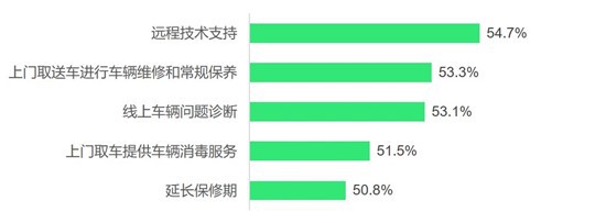 特殊時期,車主希望汽車品牌和經(jīng)銷商提供遠程技術(shù)支持(54.7%)和線上車輛問題診斷服務(wù)(53.1%),以盡量減少進店頻次。線上服務(wù)需求對廠商的數(shù)字化能力提出了更高的要求。此外,五成車主希望經(jīng)銷商提供上門取送車保養(yǎng)或消毒服務(wù),經(jīng)銷商應(yīng)把握上門服務(wù)機會,創(chuàng)造新的服務(wù)需求。