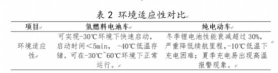 氫燃料電池車(chē)與純電動(dòng)車(chē)的環(huán)境適應(yīng)性對(duì)比如表2所示。