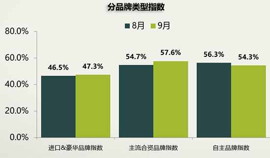 品牌類型方面,9月份進(jìn)口&豪華品牌、主流合資品牌指數(shù)環(huán)比上升,自主品牌指數(shù)環(huán)比下降。樊宇表示,豪華品牌繼續(xù)領(lǐng)跑,庫存處于警戒線以下;合資品牌則出現(xiàn)明顯的分化,庫存壓力上升;自主品牌市場(chǎng)份額小幅回升,銷量穩(wěn)定增長,庫存壓力得到一定緩解。