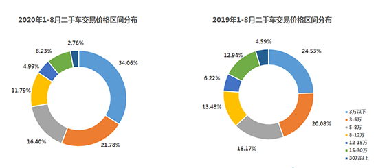1-8月,全國二手車市場(chǎng)累計(jì)交易量811.47萬輛,同比下降12.50%。其中,3萬元及以下價(jià)格區(qū)間的車輛增長9.53%;3-5萬區(qū)間增長1.70%;5-8萬區(qū)間下降1.76%;8-12萬區(qū)間下降1.69%;12-15萬區(qū)間下降1.23%;15-30萬區(qū)間下降4.71%;30萬區(qū)間以上下降1.83%。