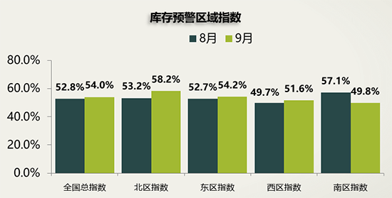 從區(qū)域情況來看,北區(qū)指數(shù)為58.2%,東區(qū)指數(shù)為54.2%,西區(qū)指數(shù)為51.6%,南區(qū)指數(shù)為49.8%,是唯一位于警戒線以下的區(qū)域。樊宇表示,臨近四季度,經(jīng)銷商進(jìn)入秋季補(bǔ)庫周期,而南方地區(qū)的廣東、湖南、湖北等省份銷量增速較快,庫存壓力略有緩和。
