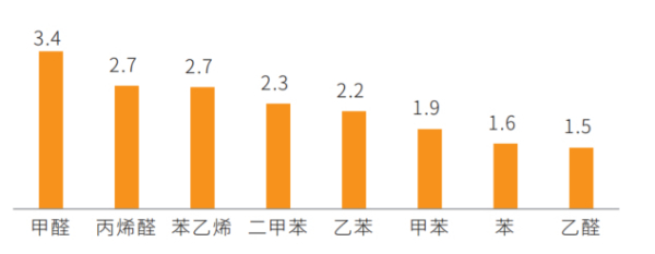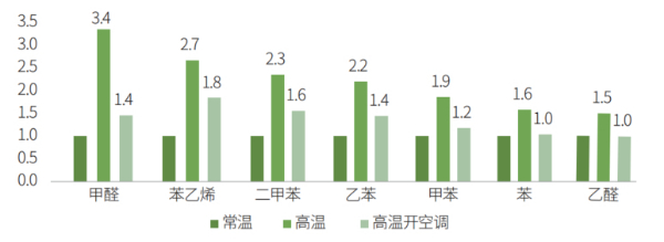 高溫模式下的揮發(fā)性有機(jī)物測(cè)評(píng)結(jié)果不如人意,濃度平均為常溫下的2倍。甲醛、乙醛、二甲苯和苯乙烯分別為常溫模式的3.8倍、1.5倍、2.3倍和2.7倍。由此可見(jiàn),消費(fèi)者“溫度越高,車?yán)镂兜涝酱蟆钡臉闼馗兄c測(cè)試結(jié)果相符,高溫下的車內(nèi)污染問(wèn)題亟待解決。?