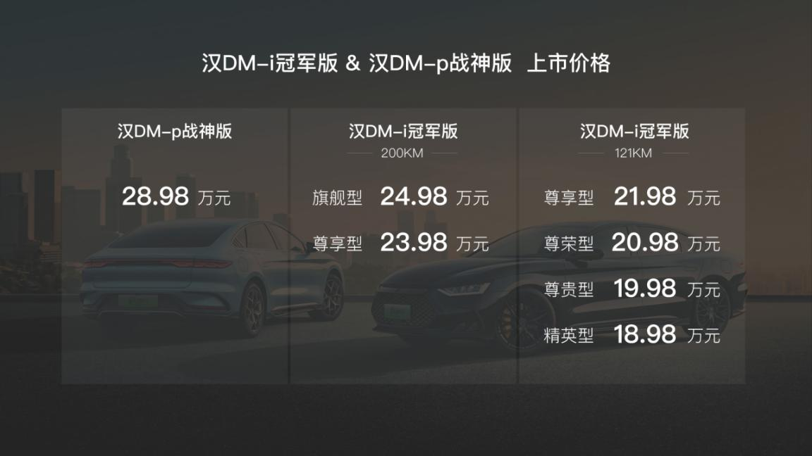 此次,產(chǎn)品實力全面進階的漢DM系列兩款車型中,漢DM-i冠軍版的價格區(qū)間為18.98萬元~24.98萬元,漢DM-p戰(zhàn)神版的價格為28.98萬元。此外,全新漢DM系列還為用戶準備了5大智聯(lián)在線服務(wù)、5大專屬貴賓服務(wù)、2大無憂購車政策等多重購車禮遇。